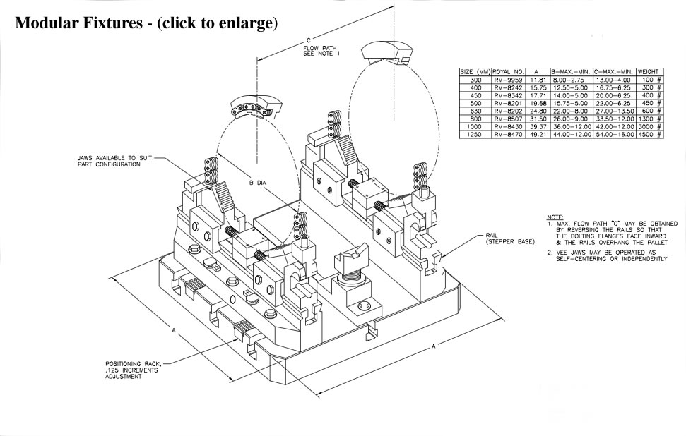 Specially designed hydraulic and manual fixtures hold parts that are large or have unusual configurations or are difficult to machine. Where feasible, Royal Machine and Tool will provide modularity and interchangeability to allow the lowest cost solution with ergonomics and safety in mind.