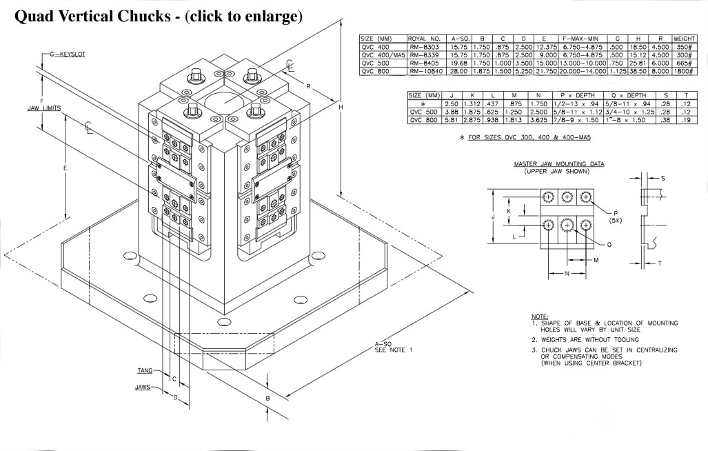 Hold up to 8 parts in the Quad Vertical Combination Chuck on horizontal machining centers. Permits virtual continuous spindle use, decreased tool changes, and practically eliminates downtime for parts change-over. Chuck jaws can be set in centralizing or compensating mode.